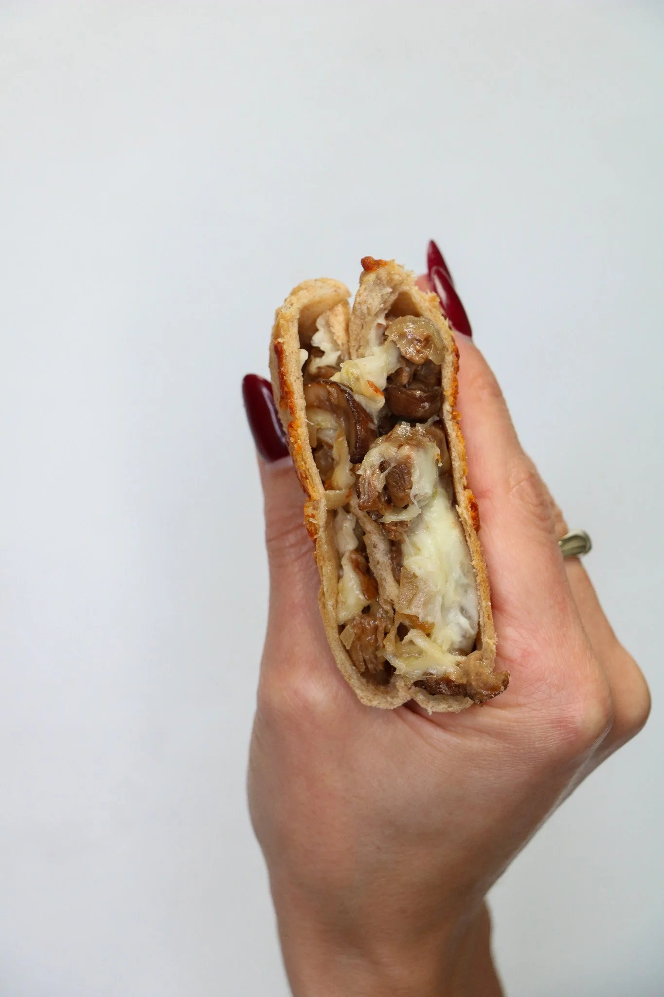 For pizza pockets, add 1-2 tablespoons of pizza sauce, making sure to avoid edges and keep them clean (this is important to be able to seal pockets). Spoon 2–3 tbsp of filling onto one half of the circle, still leaving a border around the edge. You can make half the batch with pizza filling, half with cheesesteak filling.
